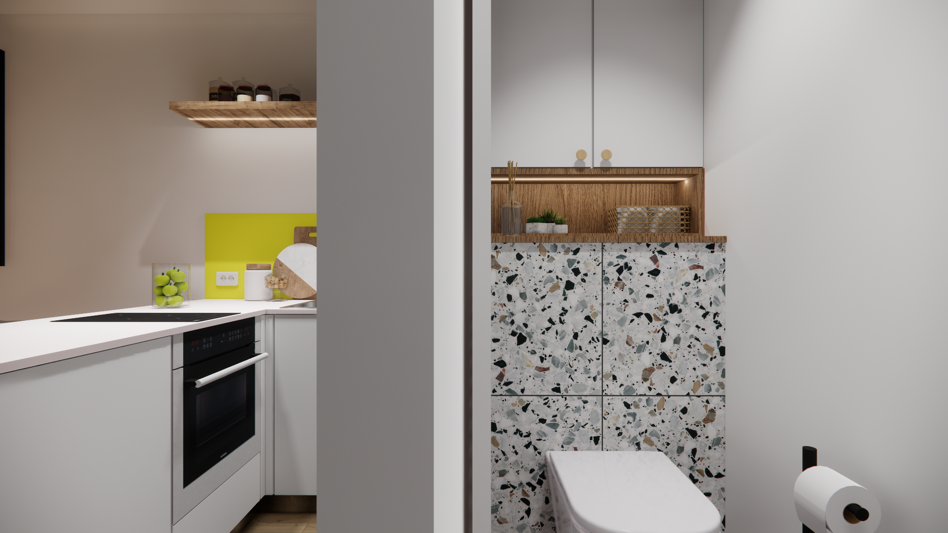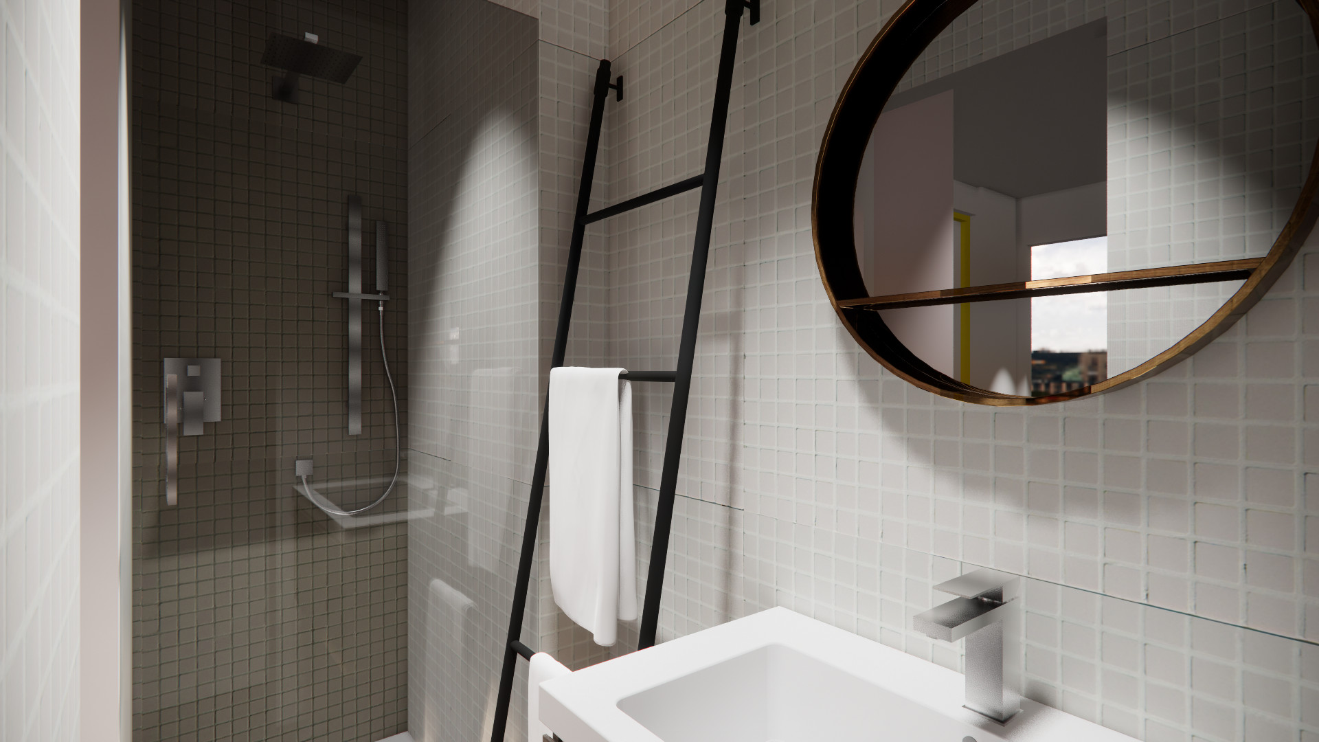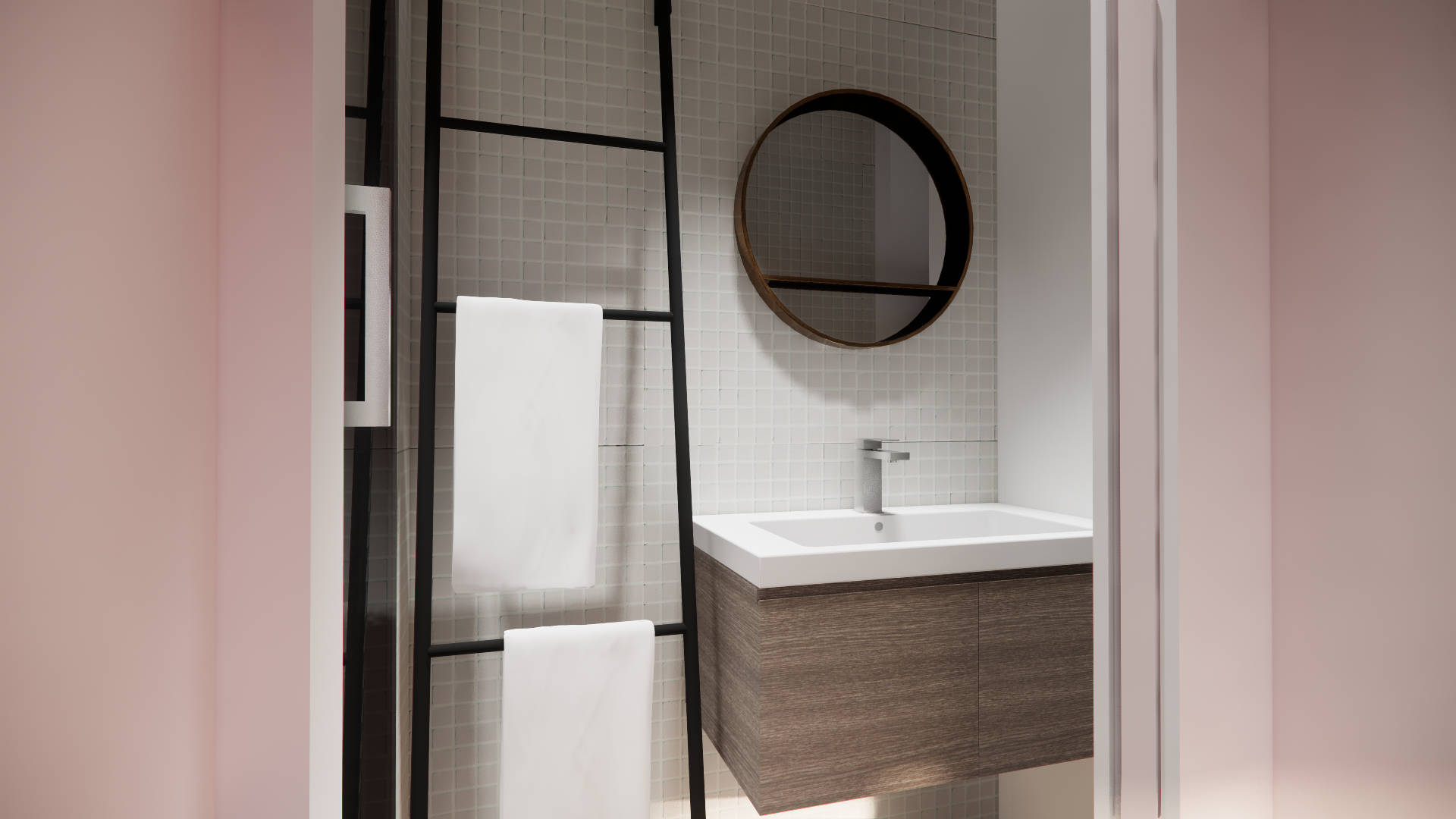 L’agencement a été pensé pour conjuguer praticité et confort : la salle d’eau s’ouvre sur la chambre, tandis qu’un espace séparé accueille WC et buanderie, permettant de préserver l’intimité et la fonctionnalité du lieu.