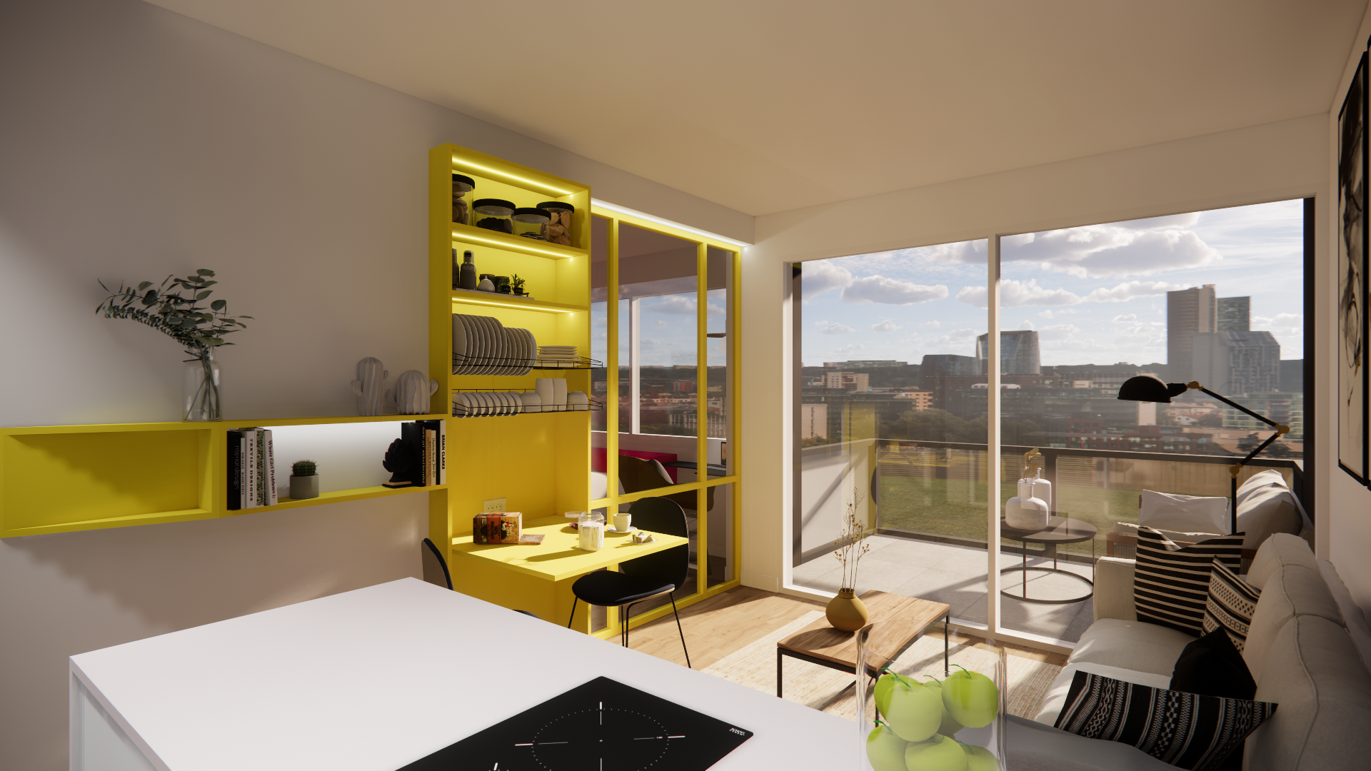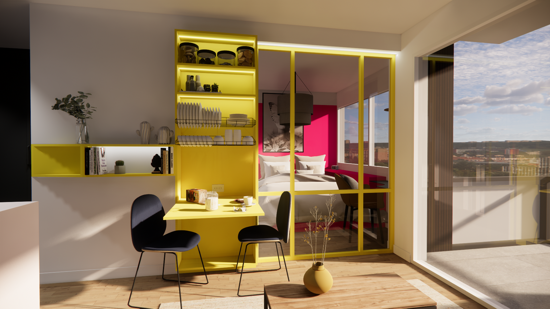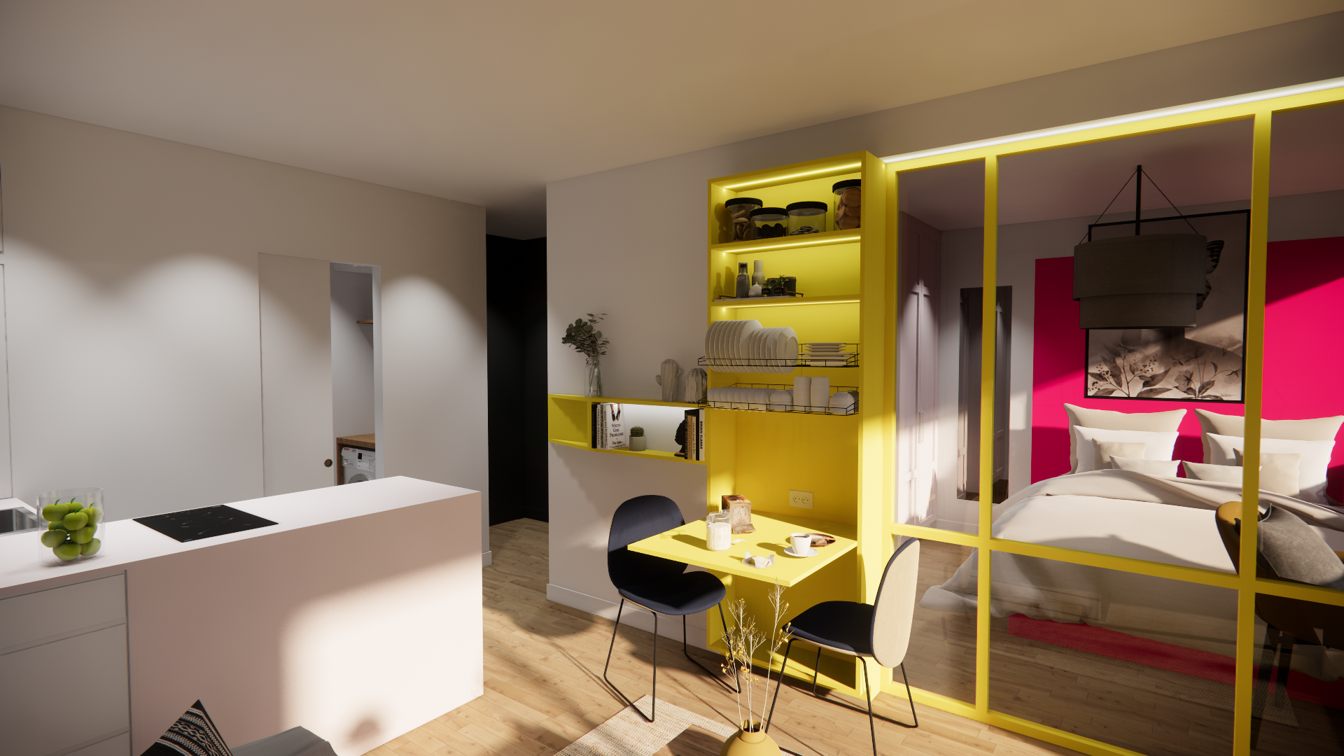 Côté décoration, l’accent a été mis sur la couleur vive, apportée par touches pour dynamiser l’espace et lui donner une identité affirmée. Chaque détail a été étudié pour renforcer la fluidité des circulations et tirer parti de la surface disponible.