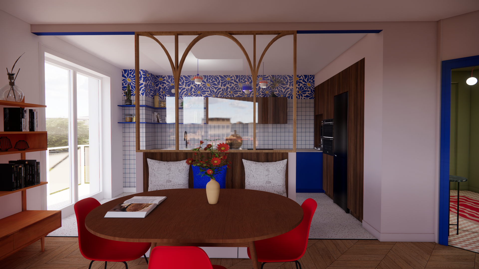 La cuisine, volontairement choisie en bleu électrique, devient une pièce maîtresse du projet. Semi-ouverte sur le séjour grâce à une verrière en bois sur mesure, elle allie convivialité et originalité, affirmant un style assumé et distinctif.